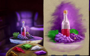 rechts van de werkbank staat een pot met verf. Doop hier het gordijn in en je krijgt een paars gordijn (purple curtain).