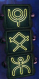 Zet de symbolen net zoals je ze zag in het ornament op tafel. Bovenaan opgeheven armen met een cirkel ertussen, daaronder een vis met de bek naar boven en onderaan een staf met gebogen armen naar boven en gebogen armen naar beneden.