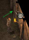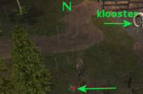 Loop door het dorp en bezoek alle andere huizen, zodat ook die op de plattegrond aangetekend worden. Je kunt vanaf dan, door op een rood kruisje te klikken, rechtstreeks terug gaan naar die plek. Klik met een groene kruis-cursor in de plattegrond. Het betekent dat je daar nog niet geweest bent. Je krijgt vervolgens een richtingwijzer op je scherm.
