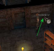 Verlaat de cel door de andere deur en ga naar rechts. Aan het einde van de gang sta je voor 2 tonnen. Ga hier links de kamer in, waar je een grote houten bewerkte deur ziet.