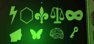 Enkele etiketten dragen ook een symbool, één van de vier die je op de muur naast de kluis aantrof.