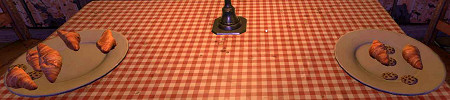 Het gaat om de kaars die zich op de ronde tafel rechts achterin bevindt.