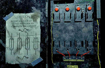 Links daarvan hangt een zekeringenkast aan de wand. De tekst luidt: Opgepast, breng alle vier zekeringen in volgorde aan om de stroomkring te voltooien.