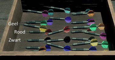 En kijk op het rechter deurtje welke kleur werppijltje bij welk cijfer hoort.