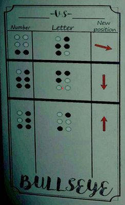 Het schema bevat onder elkaar drie cijfers (number), daarnaast drie letters en daarnaast drie rode pijlen in verschillende richtingen die een nieuwe positie aanduiden (schuin naar rechts beneden, recht omlaag en recht omhoog).