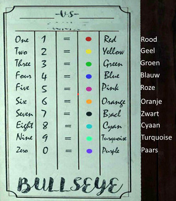 Aan de binnenkant van het rechter deurtje staat beschreven welke kleur werppijltje bij welk cijfer hoort.