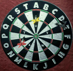 In de kast hangt een doelwit voor de werppijltjes, voorzien van de letters A tot en met Z.