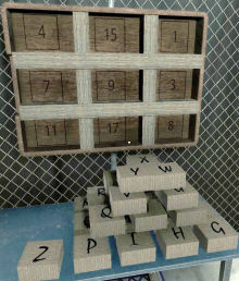 Ervoor ligt een stapel van 26 blokken, elk met één letter van het alfabet.