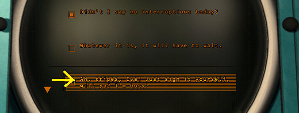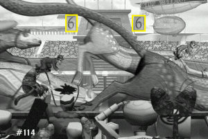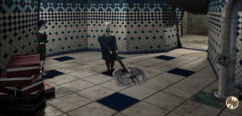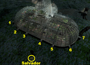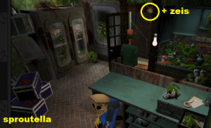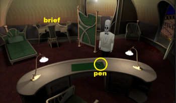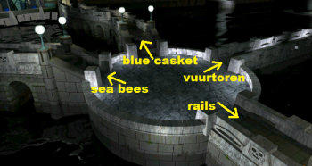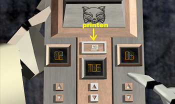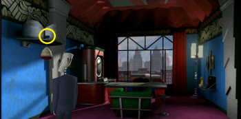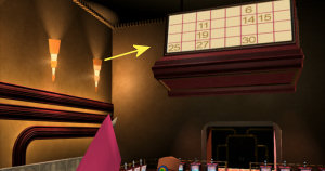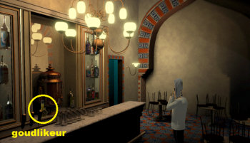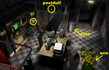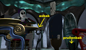 Manny staat buiten te roken en wordt binnengeroepen, omdat een klant hem wil spreken.Ga naar binnen en dan naar links waar een bureau staat. ![]() Pak de pen op het bureau. Dat laat een roullettebord omdraaien. Je kunt het manipuleren. Je hoort wat er in de rouletteruimte wordt gezegd. Je kunt hier nog niets doen. Ga de tafel bekijken tegenover het bureau. Pak daar de brief van Limones. Lees de brief in de inventaris net zo lang tot je alle informatie hebt gelezen. Manny leest dat de postduiven personen kunnen vinden door naar een foto van een adres te kijken en hij wordt gewaarschuwd voor Hector LeMans die het Departement van de Doden corrumpeerde. Limones zegt zijn zoektocht naar Meche even op te geven. Ga rechts van de tafel het zithoekje in en daar door de deur de trap af. Loop dezelfde richting uit, naar de volgende trap. Je ziet Glottis piano spelen. ![]() Ga de trap af en praat met Glottis. Loop naar de bar, pak de goudlikeur en zet die in de inventaris. Ga de deur achter de bar door en je ziet de speelzaal. Bekijk Bogen de politiechef en praat met Charlie in de zithoek. Hij zegt dat hij niet meer bij de kattenraces mag zijn omdat hij weddenschapskaartjes had vervalst. Manny pakt zijn kaartjesprinter af. Hier is verder niets te doen. Ga terug de trap op en praat met Lupe achter de balie. Ze maakt een nieuw systeem voor het afgeven en ophalen van jassen en heeft verder niets te vertellen. Ga daarna links de deur door en de trappen af. Manny ziet een monsterachtige vogel die met Meches stem tegen hem praat. Hij kijkt vanzelf door de verrekijker waar de vogel heen gaat en ziet dat Meche gedwongen wordt het schip de Lambada op te gaan. Manny valt in het water en wordt weer gered door de havenmeester. Die probeert een scheepje in een fles te stoppen. Zeg hem dat je aan boord wil gaan van de Limbo. Dat is een vrachtscheepje en iedereen aan boord moet daar werken. Zeg dat je dat wilt en je hoort wat de eisen daarvoor zijn: Er is werk voor Glottis, maar Glottis moet zijn eigen gereedschap meenemen. Er is een lid van de bemanning dat nog niet aan boord is gegaan. Die heet Naranja en verzorgt het eten op het schip. Dat zou een baan kunnen zijn voor Manny, als hij tenminste een vakbondskaart heeft en Naranja niet op komt dagen. Het Sea Bee gereedschap voor Glottis moet Manny maar vragen aan een Sea Bee en Naranja zal thuis zijn om recepten uit te zoeken. Ga links de steiger op en je komt op een platform waar 4 doorgangen zijn. ![]() Als je naar onder gaat, kom je bij spoorrails met links een afgesloten hek waarachter het dok van Meches schip was. Als je naar links gaat, zie je in de verte wat bewegen. Ga er kijken. Het zijn Sea Bees. Praat met hen. Een van hen heet Terry. Ze zijn geen lid van de vakbond. Ze noemen Maximino de grootste baas In Rubacava en kunnen verder niet helpen. Ga naar rechts en loop naar de vuurtoren. Die is gesloten. Ga dus terug naar de Sea Bees en daar naar links. Ga bij het gebouwtje naar rechts en je bent bij de "Blue Casket" met een lift en een ingang. Ga nog niet naar binnen, maar bekijk wat er rechts is. Je bent terug bij het platform. Neem de noordelijke doorgang en je bent terug bij de "Blue Casket". Ga links de lift in. Vandaar kun je met een trap naar onder of naar boven. Ga eerst kijken wat er in de buurt te zien is. Ga de trap af. Ga de boogpoort door en loop naar rechts. Je ziet een nieuwe zeppelin hangen. Ga terug naar links tot je weer bij de lift bent. Ga naar boven, volg de pijl aan de muur. Hier kun je naar rechts waar de verrekijker is, die je zag toen Meche aan boord ging. Ga echter de trap op naar café Calavera. Ga naar binnen en dan naar beneden. Praat met Glottis. Manny zegt dat hij een boot gaat regelen om achter Domino en Meche aan te gaan. Ga de deur achter bij de bar door. Vraag aan Charlie of hij vakbondskaarten kan namaken. Hij wil er een voor Manny maken als Manny Charlies geld terug haalt. Maximino heeft Charlies koffer met geld in zijn safe liggen in zijn wijnkelder. Charlie geeft Manny zijn VIP-kaart voor de High Roller's club. Bekijk de kaart. Ga terug en loop rechts naar Glottis toe. Praat met hem en Glottis verdwijnt met de VIP-kaart. Ga de trap op en links de deur door. Ga de twee trappen af en door de boogpoort naar achteren. Ga bij de neonpijl naar links en neem de lift naar beneden. Ga daar naar rechts en je bent weer bij het platform. High Roller's Club Neem de onderste doorgang en je bent bij de spoorrails. Je zag al eerder het gesloten hek naar het dok. Bekijk het deel waar een hendel staat. Daar is een vouwbrug naar de plek waar kattenraces gehouden worden. Trek aan de hendel en loop over de brug heen. Ga de trap op en je ziet toeschouwers van kattenraces. Ga naar rechts en bekijk de kat in de vitrine. Lees de plaquette over de kat. Hierin staat een hint voor een later probleem. De kat kwam om tijdens een race in de 2e week van het seizoen, omdat een zeppelin insloeg in de racebaan. ![]() Ga naar rechts en je ziet een enorme kattenbak en enorme blikken kattenvoer. Pak de blikopener van het linker blik af en ga terug naar de vitrine en dan naar onder. Je bent weer bij de toeschouwers van de race. Ga de trap op. Manny loopt vanzelf naar het balkon vanwaar hij de renbaan ziet. Ga 2x naar rechts. Aan de linker kant van het loket is een doorgang naar de High Roller's Club. Ga erdoor en neem de lift voor je. Boven zie je Glottis. Ga de boogdeur door van de keuken. Je ziet iemand een wijnvat naar de lift rollen. Pak in de linker hoek onderaan de druppelaar (turkey baster) van het rekje. De ober die af en toe binnen loopt, wil geen klanten in zijn keuken. Bekijk de voorraadkamer als hij weg is en sluit hem op, als hij de voorraadkamer weer ingaat. Zet de zeis in het slot van de deur, zodat de ober er niet uit kan. Je ziet kort dat de ober neer valt. Het kan zijn dat Glottis nu binnenkomt om een wijnvat leeg te drinken. Zo niet, dan doet hij dat later. Ga rechts kijken, waar een vatenbezorger in slaap staat bij een liftdeur. Praat me