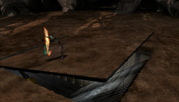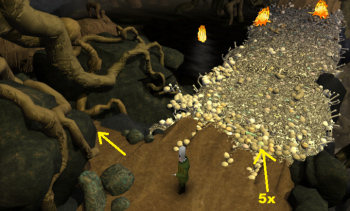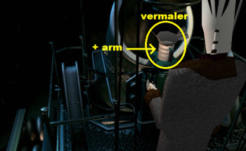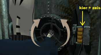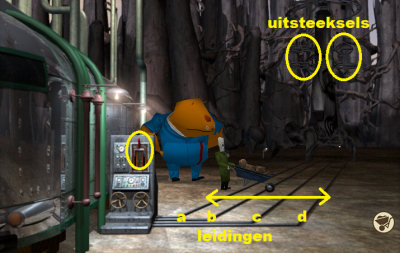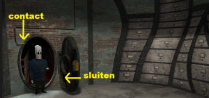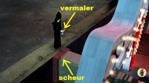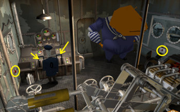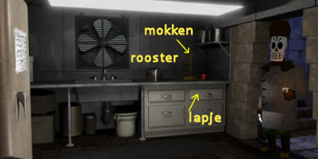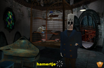 Manny staat aan dek. Daar krijgt hij van een postduif een bericht van Salvador Limones. Die zegt dat Meche zich overboord heeft gegooid bij 'De Parel' en niet in Zapata zal zijn. Hij waarschuwt Manny niet naar Zapata te gaan.Ga naar onder via de pijl en bekijk eventueel de luchtkokers. Ga naar boven en dan de deur links door naar rechts. Bekijk de dode met bloemen en ga de ladder af, waar meer lijken met bloemen liggen. Daar wordt Manny aangevallen, maar gered door Glottis. Ze vluchten de machinekamer in. Ankerpuzzel ![]() Kijk links of rechts door de patrijspoort en je ziet kettingen van ankers hangen. Bekijk de ketting. De ankers zijn neergelaten. Ga de close-up uit met de pijl bovenaan het scherm. Met de rode knopjes onder de patrijspoorten controleer je de ankers. Bekijk de machine onderaan het scherm. Glottis zegt dat hij die niet sterk genoeg heeft kunnen maken om het schip van de ankers los te scheuren. Bekijk de machine achteraan. Er zitten hendels aan om de motoren te bedienen. - Trek aan de hendels. Je ziet nu pijlpunten die 4 kanten controleren om het schip te bewegen. Klik op links en dan op rechts om het schip op dezelfde plek te laten liggen. Je ziet dan het schip van onderaf. Met twee ankers in de bodem krijg je het schip niet in beweging. Ga de close-up uit met 'Exit'. - Haal het rechter anker op door op de knop te drukken bij de rechter patrijspoort. - Bedien de hendels: kies de linker pijl en het schip ligt aan de linker kant van het scherm. Ga uit de close-up. - Druk weer op de knop bij de rechter patrijspoort om het anker neer te laten en druk dan weer op die knop om het anker op te halen. - Kijk door de rechter patrijspoort en je ziet dat de ankers in elkaar haken. - Selecteer de zeis en gebruik die om de ankers vast te maken aan de patrijspoort. - Druk op de knop bij de linker patrijspoort en de vastgehaakte ankers maken een scheur in het scheepswand. - Gebruik de hendels en duw ze naar achteren met de bovenste pijl. Het schip scheurt in twee en het deel met Manny en Glottis erop vaart weg. Chipito ![]() Het schip zit vol water en zinkt. Praat met Glottis. Die kan het daar niet lang uithouden. Hij wil niet dat Manny het donkere gedeelte in gaat. Links zie je een lichtje van De Parel. Er loopt een figuurtje voorbij met een lichtje. Als je te langzaam bent om met hem te praten, is dat niet erg. Chipito loopt alleen maar rondjes en komt meerdere keren voorbij. Klik op Chipito om met hem te praten. Vaak lukt dat niet. Dan sta je op de verkeerde plek. Tip: ga bij het heuveltje staan links van het scherm en vraag het figuurtje of je mee mag lopen. Ze lopen dan met zijn drieën zingend een rondje. Stel alle vragen op het scherm. Chipito wil het licht niet afgeven. Hij heeft 'de Parel' nog nooit gezien. Hij denkt dat het lichtje links de maan is. Hij probeert uit het land van de doden te komen door zich op de maan te oriënteren. Hij heeft niet door dat hij zo steeds rondjes loopt. De koraal die hij heeft gevonden, blijft licht geven. Koraal is aan de rand van de wereld te vinden. Chipito gaat weer een rondje lopen. Klik op Chipito als weer bij het schip is en aan de rechter kant van het scherm staat. Probeer de lamp te stelen en klik meteen daarna op Glottis. Die pakt zowel Chipito als diens lamp op. De Parel, de rand van de wereld De drie komen aan bij een octopus, die een onderzeeër bewaakt, vlakbij De Parel. Loop door naar boven. Daar is een rots begroeid met eendenmossels. Volg de pijl omhoog om om de rots heen te lopen. Chipito blijft vastzitten in tentakels. De octopus grijpt hem en Glottis en Manny gaan aan boord van de onderzeeër. Ze komen aan bij de rand van de wereld. Boven het midden van het scherm is een pijl naar rechts. Ga kijken wat daar is. Je ziet een lopende band die naar links beweegt en boven het water uitkomt. Je kunt erop springen en naar boven lopen. Dan sta je voor een enorme machine met een trap ernaast. Ga terug en trek aan de hendel. De lopende band beweegt nu naar rechts waar een lang soort rails is. Aan het eind van de rails is een dikke ketting waarlangs je naar beneden kan klimmen. Dit wordt niet met een pijl aangegeven. Ga terug en laat de lopende band weer naar links lopen door aan de hendel te trekken. Ga terug naar links, waar Glottis is. Loop vooruit met de pijl naar boven. Manny gaat kijken of hij Meche kan vinden. Als hij uit de lift is, zie je links een afgesloten deur. Ga over de brug heen naar rechts en volg de brug verder tot je in een kamer bent met een zitbank. Zie dat er op de tafel kinderboeken staan. De prullenbak is leeg en de asbak is schoon en niet weg te nemen. Ga naar links en de deur door. Meche is daar en Domino komt binnen. Die laat Glottis door een valluik in zee vallen en zegt dat Manny zijn taak hier moet overnemen. Hij wil zelf terug naar de stad. ![]() Manny is nu in zijn nieuwe kantoor. Daar zijn twee kinderen met engelvleugeltjes in een kooi opgesloten, omdat ze bijten. Praat met hen en gebruik alle gesprekopties. Het is duidelijk dat Domino nare dingen over Manny heeft verteld. Ze maken gloeilampen en een van hen gooit een hamertje naar Manny. Als Manny de deur van de kooi openzet gaan ze er niet uit weg, omdat ze bij Meche willen blijven. Als Manny zegt dat hij hun ouders zal vervolgen als ze hem bijten, beginnen ze hard te huilen. Pak na het gesprek het hamertje van de vloer, zet het in de inventaris en ga de deur door. Volg het pad tot je weer in de kamer met de zitbank bent. Praat met Meche en gebruik alle opties. Ze wil zijn revolver en hoe vaak Manny ook zegt dat hij niet voor Domino's organisatie werkt en geen revolver heeft, Meche gelooft hem niet. Zeg dat je denkt dat ze moeten praten. Vraag waarom ze voor Domino werkt. Dat is om de kinderen te beschermen. Ze kunnen niet ver vliegen maar wel om Domino heen vliegen en dan bijten. Domino heeft ze daarom opgesloten. Ga links de deur door en praat met Domino. Hij wil weg van het eind van de wereld en Manny moet zijn taak overnemen. Gebruik alle opties op