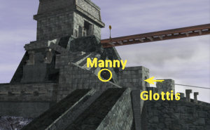 Glottis valt van het gebouw waar ze zijn aangekomen bij een toegangspoort.Loop helemaal naar beneden. Bekijk de auto's en het hek. Er is geen echo, Manny is bij het eind van de wereld. Bekijk de doodskist en open hem. Bruno komt eruit en is boos dat hij 4 jaar geleden door Manny in deze kist is gestopt met alleen maar een mok. Stop de mok in Manny's inventaris. In de inventaris zie je dat er inpakschuim in zit, dat Manny voor Bruno's verzending gebruikte. In de auto's liggen lege doodskisten. Ga de trap op. De bewaker van de 9e onderwereld zegt dat doden zonder kaartje niet worden toegelaten. Bekijk de bewaker en praat met hem over de trein, die net aankwam en van het spoor afreed. Een dode mag zijn kaartje niet verkopen daarom zijn de doden gevangen gezet. Manny zegt dat de kaartjes niet verkocht zijn, maar gestolen door Hector LeMans. Manny moet de echte kaartjes overhandigen, maar die zijn in El Marrow. De bewaker helpt hem niet. Ga de poort onder de bewaker in en loop onderaan het scherm uit. Je ziet Chipito rondjes lopen. Praat met hem. Daarna vervolgt Chipito zijn weg naar zijn bestemming. Ga de zwarte deur door. Manny wil niet weg zonder zijn vrienden. Loop onderaan naar links en ga dan naar rechts bij de vijver. Als je dan dezelfde weg blijft gaan, kom je weer bij de bewaker. Ga de richting op van de lucht waar je een pijl ziet. De bewaker geeft een briefje dat een vogel met doodskophoofd voor Manny heeft afgegeven. Lees het briefje in de inventaris. Het is van Hector LeMans, die zegt hem te komen 'sprouten'. ![]() Loop weer naar het licht en ga naar beneden. Manny blijft halverwege de trap staan. Recht voor hem staat een stenen gebouwtje. Ga dat gebouwtje in. Daar ligt Glottis met blauwe mannetjes om zich heen bij de trein. Praat met de blauwe figuurtjes. Ze zeggen dat Glottis erg ziek is, omdat hij te lang geen auto heeft gereden, want daar is Glottis voor gemaakt. Manny voelt zich schuldig, want door hem werd Glottis ontslagen. Glottis kan genezen, als hij met een voertuig rijdt, dat sneller is dan een gewone auto. De vrachtwagens die de doden aanleveren zijn te langzaam om Glottis te helpen. De wezentjes zijn net als Glottis monteurs en geven Glottis weinig kans om te overleven. Zeg tegen Meche dat ze naar El Marrow moeten om de kaartjes te halen. Ze staat links van Glottis' hoofd. Bekijk de gondel. Die is te langzaam en te klein voor Glottis. ![]() Ga de trap af en links de keuken in. Lees het briefje op de koelkast. Die is afgesloten door het departement van faciliteiten. Bekijk de spullen op het aanrecht. Er staat een mokkenrekje en een broodrooster met gebruiksaanwijzing. Bekijk de mok in de inventaris. Er zit verpakkingsschuim in. Pak een schoonmaakdoekje uit de la rechtsboven. Ga de keuken uit. Bekijk het rode kastje naast de vaten olie. Zo'n kastje had Glottis vroeger ook. Het kastje is gesloten. Dip het doekje in de olie. Ga de keuken weer in. Olie het rooster met de lap. Manny doet er vanzelf brood in. Dat vliegt in brand en wordt geblust door een mecanicien. Pak nog een lapje uit de la en doop hem weer in de olie. Ga de keuken in en hang de mok aan het rek. Doe de lap in het rooster. De mecanicien komt weer blussen. De mok vliegt ook in brand en door het schuim vliegt de mok razendsnel door de lucht. De mecaniciens zien dat dit brandstof voor een raket zou kunnen zijn en ze laten Manny met Glottis en Meche per raketsnelle trein vertrekken naar Rubicava. Glottis komt bij. Rubacava, uitschakelen bom Daar zien ze Glottis'autootje, waar een bom aan vast zit. De dominosteentjes zullen de wagen laten ontploffen. Ga hier weg. Ga links de brug over en je bent bij het platform. Neem het pad naar rechts en praat met de havenmeester. Pak het flessenscheepje. Het is nog niet klaar. Ga links terug naar het platform en naar onder waar Glottis bij het spoor staat. Ga naar rechts en daar de trappen af naar de tattooshop. Ga er naar binnen. Er klinkt gesnurk. Ga naar links waar tatoeëerder Toto slaapt. Ga terug naar de ingang en open het kastje aan de muur. Zie in de inventaris dat Manny een flesje vloeibare stikstof heeft gepakt. Ga de ladder op, loop terug naar waar Glottis is en ga links de brug over. Neem de weg omhoog vanaf het platform naar de Blue Casket. Ga naar binnen en loop naar de keuken onderaan het scherm en dan links de deur door. Er staat een groot wijnvat vol gelatine. Vul het flesje van het scheepje met gelatine en het lijkt of het scheepje in zeewater drijft. Ga de keuken uit en Olivia spreekt Manny aan. Ze wil met hem mee. Ga de Blue Casket uit, loop naar rechts en bij het platform naar onder. Selecteer het scheepje in de fles en geef het aan Glottis. Die vindt het wel lekker en gaat naar de Blue Casket om het vat gelatine leeg te drinken. Bekijk Glottis als hij terug is. Hij staat op ontploffen. Praat met hem en Glottis geeft over. Bekijk de auto en je ziet dat alle dominosteentjes omver zijn gekotst. Bekijk de gelatine en selecteer de stikstof. Gooi die over de gelatine op de vloer. Manny kan nu naar de wagen doorlopen. Activeer de explosieven. In een tussenscene zie je dat de rebellengroep gegroeid is en dat Hector een van hun spionnen in zijn lab heeft gevonden en doodt. Manny is in het hoofdkwartier van de rebellen. Eva en Meche zijn daar ook. ![]() Praat met Meche en zij bedenken een plan. Bekijk het dode lichaam en pak de arm. Kijk in de vuilnisbak en Manny haalt er een foto uit van de rebel die door Hector werd gedood. Bekijk het papier op Eva's werktafel en bedien de radio. Bekijk de drie monitoren. Op de onderste zie je wapenhandelaar Bowsley, een bloemist die voor Hector werkt. Achter de tralies zit een postduif. Geef het papier met de bedreiging van Hector aan de duif. Geef hem ook de foto van de gedode rebel en de duif gaat de post afleveren bij de bloemenman van Hector. Bowsley denkt dat de dreigbrief voor hem is en vlucht. Op de onderste monitor zijn nu nog alleen bloemen te zien. Ga weg uit het hoofdkwartier en loop naar onder waar Glottis is. Ma