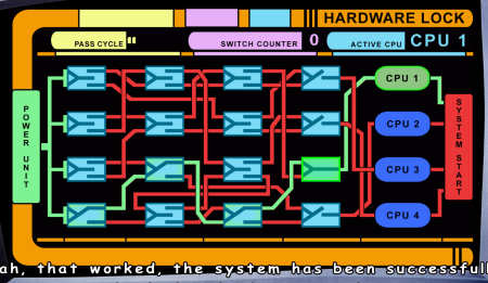 Ga met je de cursor over je scherm. Als je op de computer komt, zie je dat Hayseed zijn computer Sybil noemt. De cursor verandert in een handje met de tekst "turn on Sybil" (zet Sybil aan).