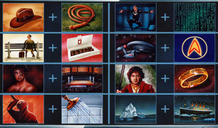 Je ziet scènes en voorwerpen uit beroemde films. Het is de bedoeling dat je bij elkaar horende plaatjes, in paren naast elkaar zet.