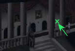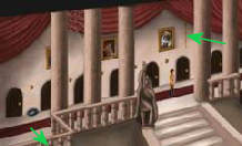 De alarmbel klinkt en Geraint zal de trap op komen. Ren dus onmiddellijk naar links en spring over het balkon (hand-cursor) bij de slaapkamer van de koning.