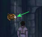 Helemaal links op de overloop zie je een omgevallen blauwe vaas, naast de deur van de slaapkamer van de koning. Raap de vaas op met je hand-cursor en je vindt de scepter van de koning (+1% wisdom).