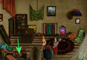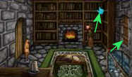 Beklim de ladder, loop naar rechts, de trappen op en duw het luik open (met hand-cursor). Maeldun en Branwyn staan in de overhoop gehaalde bibliotheek van het kasteel.