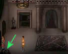 Als je al de gordijnen in brand hebt gestoken, ga je nu, vanaf de troonzaal, aan de onderkant van je scherm naar de hal.