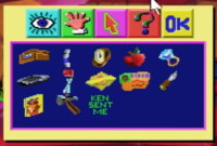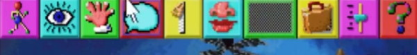 Klik daar op een icoontje (lopen, praten, pakken etc.) en je cursor verandert van een aanwijspijl in het icoon van je keuze. Je kunt daarna de gewenste actie in het scherm uitvoeren door met je icooncursor te klikken op een voorwerp of persoon.