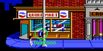 Op de plek waar je uitstapt, hangt een blauwe openbare telefoon aan een lantaarnpaal. Bekijk hem -look at phone- en Larry vindt aan de zijkant een nummer: 555-6969 (1-12/222). Dat klinkt interessant.