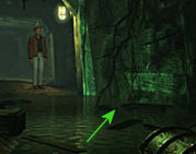 Aan de linker muur hangt een waterbekken (sink) met een stenen hoofd van de God van het Water erboven. Links van het hoofd een kleine opening, alsof het een gat is voor een vlaggestok of een hendel. Stop je hamer in het gat en trek daarna aan je geïmproviseerde hendel. Er gebeurt niets.