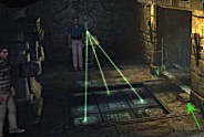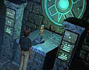 Loop de tempel in. Martin ziet een grote platform in het midden van de ruimte staan. Eromheen staan drie zuiltjes. Plaats op elk zuiltje een van de sleutelbeeldjes, rechts het groene, links het rode en het witte in het midden. De iris van het platform opent en een machine waarin een alien zichtbaar is, rijst omhoog.