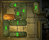 Beklim de trappen. Martin staat weer voor een dichte deur. Op de deur zit een schuifpuzzel-slot. Bekijk de schuifpuzzel. Schuif met de vakjes tot je het middelste vakje vrij hebt. Leg dan het amulet hierin. Nu worden er ineens onder de schuifstukjes symbolen zichtbaar.