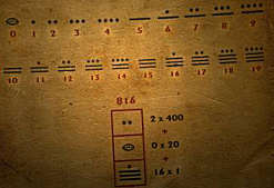 Bekijk de oude plattegrond (old Mayan map) in je inventaris. Draai hem om, door op het pijltje links boven te klikken. Aan de achterkant zie je hoe de Maya's getallen noteerden: met strepen en punten. Ook kun je zien hoe het getal 816 in een kolom wordt weergegeven. In het onderste blok de eenheden, in het middelste blok de 20-tallen en in het bovenste blok 400-tallen.