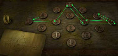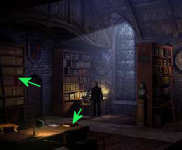 Ga met je cursor op het boek staan. Je ziet nu een oog-icoon en een hand-icoon. Rechtsklik om het boek te bekijken. Het handelt over symbolen in geheimschrift. Linksklik om het boek over geheimschrift op te rapen.