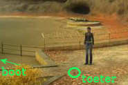 Loop dan naar de onderkant van je scherm (exit) en je krijgt een bovenaanzicht van het schip te zien. Nina staat aan de zijkant langs de reling, voor de deur naar de receptie.