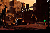 Loop naar rechts. Hier zie je op een platform een mijnkarretje (trolley) op rails staan. De rails verdwijnen in een groot gat. Als Bob en Neena hier weg willen, zullen ze het karretje moeten gebruiken.