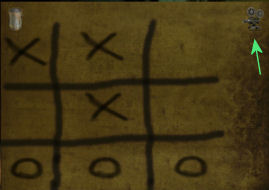 Op de tafel aan de linkerkant van de kamer, ligt een veiligheidsspeld (pin). Linksklik met de handcursor erop, om hem op te rapen.