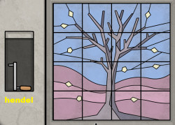 Stap uit en zie Laura met Bob.Praat met Laura. Ze zegt tegen Bob dat ze ieder hun eigen pad moeten volgen en ze neemt afscheid van hem. Ze zegt dat zijn trein om 4 uur vertrekt. Bekijk het doosje onder de bank. Er zit een klokwijzer (clock hand) in. Ga naar rechts en je ziet de dief van je inventaris in een cel. Bekijk de snack-automaat en ga naar rechts. Zet de wijzer op de klok en zet de klok op 4 uur. Praat met Bob, die je vraagt op Laura te letten en hij vertrekt. Hij verliest zijn portemonnee. Bekijk die en pak het bankbiljet (money) eruit. Open het vakje en je hebt ook een munt (coin) te pakken. Links zit ook een kaartje van The White Door, een instituut voor psychische gezondheid en vissen. Dit instituut kwam voor in het vorige spel van Rusty Lake. Ga naar rechts. Met het schilderij en de vuilnisbak is nog niets te doen. Ga dus naar rechts en praat met Laura. Ze voelt zich niet lekker. ![]() Ga naar rechts en stop de munt in de snack-automaat. Je kunt met de munt (100) 3 snacks kopen van 20, 45 en 35. Andere combinaties zijn niet mogelijk. Klik op de draaiknop onder de zakjes om ze te kopen. Ze lichten op en vallen in het bakje. Kijk in het bakje. Je moet nu snoepjes sorteren. Stop de dierfiguurtjes in het zakje waarop de hond staat, doe de snoepjes die iets met vervoer te maken hebben in het zakje met de fiets erop. De snoepjes die verwijzen naar eten of drinken, moet je in het laatste zakje doen. Klik, als je klaar bent, op het maiskoekje (corn cookie) en zoom uit. Ga 2x naar rechts en voer de duif het maiskoekje. Je moet de duif van rechts naar links de kruimels laten opeten. Klik op de duif. Hij pakt de rode kruimel niet op. Klik op een gele kruimel. Die verplaatst zich naar de eerste plek rechts. Klik dan op de duif. Hij eet nu de gele, de rode en gele kruimel op, maar stopt bij de witte kruimel. Als je de witte kruimel echter op de 3e plek legt, springt hij erover heen en eet hij verder. Probeer uit wat de duif doet als je de kruimels verplaatst. Er zijn meer oplossingen mogelijk. ![]() Oplossing: Van rechts naar links leg je: geel - rood - wit - geel - geel - blauw - wit - wit - geel - rood - wit neer. Klik op de duif. De duif vliegt weg naar de vuilnisbak. Jaag hem weg en volg hem naar rechts. Hij zit op de lamp. Jaag hem weg en volg hem 2x naar links. Jaag hem nogmaals weg en de duif komt onder de trein terecht. Bekijk het hoopje veren en pak het sleuteltje (key). Ga naar links en open de celdeur met het sleuteltje. Schuif de deur opzij en praat met de louche man. Hij heeft inventarisspullen gestolen. Je kunt die terug krijgen, als je om 9 uur geld achter laat onder de bank. Ga naar links, doe het bankbiljet in de doos. Ga 2x naar rechts en zet de klok op 9 uur. Ga 2x terug naar links en bekijk de doos. Open het zakje. Je kunt de ijzerzaag (iron saw) pakken, maar de dief heeft het gouden horloge gehouden. Open het hangslot aan het kastje met de zaag en open het kastje. Pak het paneeltje (painting panel) uit het kastje en ga naar links. Stop het paneeltje rechtsonder in het schilderij. Je ziet een vierkant in het midden. De tekening daarop kun je van links naar rechts slepen en van boven naar beneden. De middencirkel is de plek waarop je de 12 cirkels aan de buitenkant moet plaatsen. Je voegt dan 12 tekeningetjes toe aan het schilderij. Let goed op de tekening die je op de 12 cirkels ziet. Je zult bijvoorbeeld de cirkels met een zwarte onderkant onderaan in het schilderij moeten plaatsen. Als je de plek hebt ontdekt, waar de cirkel hoort, zet je de middencirkel op die plaats. Klik dan op de cirkel die je toe wilt voegen. Je voegt een man in een roeibootje toe, hotel Rusty Lake, een oude en een jonge vrouw, twee vogels, een witte en een zwarte kubus, een boom met witte bloesem en een poort. Als de puzzel is opgelost, zie je dat de vuilnisbak is omgevallen. ![]() Je ziet er allemaal spullen in waarvan je paren moet maken. - Combineer de papiertjes met 'Make' en 'Pairs' - Je ziet een stukje kaas waaraan geknabbeld is. Daaronder zie je nog iets met dezelfde knabbelranden. Combineer ze. - Combineer het pakje chips linksboven met de chip in het midden onderaan. - Leg het potlood bij de brief. - Zet het blaadje bij de tak. - Leg het papiertje met bloedvlekken bij de vinger. - Combineer de laatste twee stukjes en lees de brief aan Laura. Er zit een pil (pill) in de envelop. Ga naar rechts en geef de pil aan Laura. Leg hem op haar tong. Praat met haar. Ze zegt dat ze nachtmerries heeft. Zoom uit en je bent in een rode omgeving waarin allerlei voorwerpen en lichaamsdelen rondzweven. Die kun je naar een scherm links of rechts duwen. Laura zal je steeds zeggen waarover ze droomt. Beeld die droom uit door de zwevende voorwerpen naar de juiste figuren te brengen. Praat met Laura. Ze zegt dat ze over haar moeder droomt die baby Laura vasthoudt. Ga naar links en leg de zwevende baby in Roses hand. Schuif het zwevende hart naar rechts en ga naar rechts om Laura's volgende droom te horen. Ze droomde over Bob die zijn gebroken hart vasthoudt. Schuif het hart, de rat en de bloemen naar rechts en ga zelf ook naar rechts. Daar staat Bob. Geef hem het hart. Ga links weer naar Laura toe. Laura droomt nu over zichzelf als jong meisje. Haar moeder houdt Laura's hand vast en Laura haar moeders gezicht. Ga naar rechts. Zie de hand en ga 2x naar links. Vergeet de hand niet mee te schuiven. Neem het hoofd weg en leg de hand in Roses hand. Schuif het hoofd naar links en ga daar heen. Geef de kleine Laura het hoofd. Zie daar een vis en een kubus zweven. Ga 2x rechts naar de volwassen Laura toe en vraag wat ze heeft gedroomd. Ze droomde over een detective met een vis. Ga naar links waar de detective staat en ga naar links de vis halen. Schuif de vis naar rechts en ga dan ook naar rechts. Geef de vis aan de detective. Ga rechts weer naar Laura toe. Praat met haar. Ze droomt over een vogel die een rat vasthoudt en over de corrupte ziel met het hoofd van Rose. Ga naar rechts en je ziet een grote roodborst. H