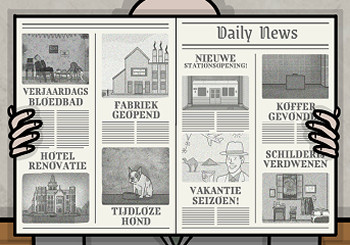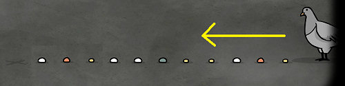 ![]() Open het koffertje links en pak het plakje worst (piece of sausage) en het potlood (pencil) eruit. Bekijk het schetsboek en stop het potlood in de vingers. Gebruik het potlood en je maakt een lijn (line) die je kunt pakken. Ga naar rechts en bekijk het voedselstalletje. Praat met de verkoper. Aan het elektriciteitskastje hangt een slot dat je niet open kunt zagen. Open de put en haal de tak eruit. Maak de lijn vast aan de tak. Ga 2x naar rechts. Bekijk de poster en klik er een paar keer op. Je ziet muzieknoten met een aantal noten aan de balk: 1, 2, 3, 1, 2, 3. Bekijk de trompettist en speel de noten na. De linker toets is voor de 1, de middelste voor de 2 en de rechter voor de 3. Hierna speelt de trompettist verder, maar de klanken haperen. Haal een vis uit de trompet. Speel zelf nog wat trompet om uiteindelijk een prestatie te krijgen. Bekijk de vis die op de grond ligt. Er komt een haak (hook) uit. Ga 2x naar links en doe de haak aan de lijn. Hang er het stukje worst aan. Pak de stok, hou de muisknop vast en hou de stok diep in de put. Je vist een rat op. Als je hem probeert te pakken, rent hij 2x naar rechts, waar de trompettist is. Probeer de rat te pakken en hij vlucht achter een tegel in de muur. Klik op de tegel en de rat duwt een papiertje naar buiten. Pak en lees het papiertje. Het is een oproep te solliciteren bij de vogelvoerfabriek. Elke dag om 5 uur worden de werknemers afgezet op het Bird Bridge Station. Ga naar links en zet de klok op 5 uur. Klik op de deur van de aangekomen trein en laat de forenzen uitstappen. Even later staan er 8 mannen op het perron. Praat een paar keer met de man in het groene colbertje. Dat is Bob, die uit vorige spelen bekend is. Hij zegt dat hij Laura kent en geeft 2 bankbiljetten (money) om voor Laura koffie te kopen en voor hem een sandwich. Ga naar rechts. Daar staan 5 mannen. Ga nogmaals naar rechts en je ziet Laura daar tussen nog eens 6 mannen. Praat met Laura. Zij denkt ook, dat ze de man met het groene colbert kent. Ga naar rechts. Bij de kiosk staan 5 mannen. Een ervan heeft zich verdekt opgesteld. Praat met deze man. Hij wil een sigaret. Geef de kioskhouder een bankbiljet in zijn handen en bestel koffie door op het bordje koffie te klikken. Pak de koffie (coffee) en bestel op dezelfde manier een sandwich. Zoom uit en ga naar links. Geef de koffie aan Laura en kijk in het kopje. Haal er een peuk (cigarette) uit en ga 2x naar rechts. ![]() Geef de sandwich aan Bob en klik erop. Bob wil de sandwich niet eten. Sleep de bovenste boterham opzij en schuif de tomaten weg. Er wriemelt een worm op het brood. Schuif het plak kaas naar onder en je ziet meer wormen. Sleep in totaal 5 wormen weg en Bob eet zijn sandwich op. Praat met hem en hij geeft je wat broodkruimels (breadcrumbs). Praat met de beide mannen naast hem. Ze zeggen dat je de man met de rode hoed moet zoeken. Ga naar links en je ziet die man bij de kiosk. Praat met hem. Hij zegt je te praten met de man met een bruine tas. Ga naar rechts waar die man staat. Praat met hem. Je mag zijn jaszak controleren. Pak de bril (glasses) uit zijn borstvakje en praat nog eens met hem. Hij zegt dat de bril van de man is met een hard hoofddeksel. Ga 2x naar rechts en geef de bril aan de man met de veiligheidshelm. Hij zegt je te praten met een lange, glimlachende man. Ga 2x naar rechts. De man staat rechts van Bob. Praat met hem en je mag zijn zakken voelen. Uit zijn borstzakje komt een stropdas (tie). Je moet een man zoeken zonder stropdas. Die man staat 2 plaatsjes verder naar rechts. Geef hem de das en hij zegt je te praten met de man met een groene das. Ga naar rechts en praat met de man met de groene das. Hij zegt dat je je vergist en met zijn tweelingbroer moet praten. Let goed op zijn gezicht. Ga 2x naar rechts en praat met de man in het midden van de groep van drie. Je mag zijn jaszak controleren. Haal een aansteker (lighter) uit het borstzakje. Zoom uit en alle mannen vertrekken. Ga 2x naar rechts naar de kiosk en geef de louche man een sigaret. Geef hem daarna de aansteker, klik erop en de man steekt zijn sigaret aan. Je krijgt de aansteker terug. Daarna vraagt hij de tijd en verdwijnt hij. Ook je inventaris verdwijnt grotendeels. Op de grond ligt een zakje. Bekijk het. De man biedt excuses aan voor het feit dat hij je beroofd heeft. Je hebt alleen kruimels en de aansteker bij je. Pak de paperclip. Open het hangslot aan het elektriciteitskastje met de paperclip. Je ziet het getal 587 met een knop ernaast. Verder zie je drie staafjes die te verplaatsen zijn. Om ze te verplaatsen versleep je de ronde uiteindes. Zie naast de gaatjes tekentjes staan. Door de staafjes te verplaatsen moet je het getal 587 maken, daarna zul je de getallen 361 en 192 moeten maken. Je moet daarvoor de tekentjes combineren. Tip: Het tekentje linksboven (een 1) combineren met het teken rechtsonder (waar niets staat) levert het getal 1 op. Van het linker tekentje op de 2e rij is samen met het 2e tekentje op de onderste rij een 9 te vormen. Als je alle drie de getallen hebt gevormd, gaat het groene lichtje branden. Oplossing: Je moet het getal 587 vormen. - 5: Zet een uiteinde op de rechter plek van de 1e rij. Zet het andere einde links op de 2e rij. - 8: Zet een uiteinde op de linker plek van de 3e rij. Zet het andere uiteinde op de 2e plek van de 3e rij. - 7: Zet een uiteinde op de linker plek van de 1e rij. Zet het andere einde op de middelste plek van de 1e rij. Je moet nu het getal 192 vormen. - 1: verbind de plek linksboven met de plek rechtsonder. ![]() - 9: verbind de plek links op de middelste rij met de middelste plek van de 3e rij. - 2: verbind de middelste plek op de 1e rij met de 3e plek op de 2e rij. Hierna moet 361 worden gevormd. - 3: verbind de 2e plek van de bovenste rij met de 1e plek op de 2e rij. - 6: verbind de 3e plek op de 1e rij met de 1e plek op de onderste rij. - 1: verbind linksboven met rechtsonder. Zoom uit. De draad van het elektriciteitskastje leidt naar links. Ga naar links. Daar zi