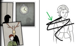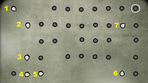 Ga de trein uit.Zie op de muur onderdelen van het gouden horloge staan. Met het zwarte hoopje op de grond kun je nog niets doen. Haal het luikje in twee keer van het elektriciteitskastje af. Draai aan het linker knopje tot dat naar rechts staat. Je ziet dat er vonken uit de kapotte leiding komen. Met de knoppen kun je de elektriciteit door de draden leiden. Zoom uit. Er zijn drie kapotte plekken in de leiding, zodat de elektriciteit niet naar links of rechts kan en ook de lamp niet bereikt. Ga links kijken waar de leiding heen gaat en ga terug naar rechts. Ga naar rechts. De elektriciteitskabel leidt naar de kast. Die kast gaat dus niet open en het doosje ernaast ook niet. Op de muur zie je grijze stippen met witte pijltjes. Klik op een wit pijltje en je ziet linksboven een bij uit het holletje komen en er weer in gaan. Je zult die bij naar het omcirkelde grijze stipje moeten leiden. De witte pijltjes zijn te verplaatsen. Als je er een op het holletje zet, gaat de bij de kant op van het pijltje. Gebruik de plekken waar geen stippen staan, om de bij langere stukken te laten vliegen. Oplossing: ![]() - Zet de pijl naar rechtsonder op het holletje met de bij. - Zet de pijl naar onder op het holletje links op de 2e rij. - Zet ook een pijl naar onder op het linker holletje van de 4e rij. - Zet op de onderste rij op de 2e en 3e plek van links een pijltje naar rechts. - Zet een pijltje naar boven op de voorlaatste plek op de onderste rij. - Zet het pijltje naar rechtsboven op de voorlaatste plek op de 2e rij. De puzzel is opgelost en de bij vliegt weg. Ga naar links en klik 2x op de zwarte hoop. Een hand pakt de bij die erboven vliegt en het hoopje verandert in een zwarte ziel, als je erop klikt. Praat met de zwarte ziel en neem de sleutel (locker key) aan. Klik nog eens op de zwarte ziel en zij laat de bij vrij. Ga naar links, pak het breekijzer (crowbar) en open kluisje 7 met de sleutel. Pak de nijptang (pincers). Bekijk het olievat en gebruik het breekijzer 2x om er een gat in te maken. Er stroomt wat olie uit het vat. Steek de olie in brand met de aansteker. Ga naar links en maak het rooster open met het breekijzer. Ga verder naar links en open de doos door het breekijzer 3x te gebruiken. Pak kluissleutel 6 (locker key). Open het hangslot aan het kastje met de nijptang. Haal het slot eraf en open het kastje. In het kastje zit een man op een elektrische stoel. Zoom in op zijn gezicht. Sleep het duct tape (piece of tape) van zijn mond. Links zie je een elektriciteitshendel om de man mee te elektrocuteren. Bekijk de tattoos op zijn armen en zoom uit. Ga 2x naar links en open kluisje 6 met de sleutel. Haal de emmer (bucket) eruit. Zie iets boven het vuurtje een kastje dat ook met het elektriciteitskastje is verbonden. Ga naar rechts en repareer het eerste stukje van de elektriciteitsleiding. Om de man te kunnen elektrocuteren moet de leiding die naar rechts leidt, stroom kunnen krijgen. Plak de tape dus op de leiding die van het kastje omhoog gaat. De elektriciteitsleiding, die naar het kastje leidt op het scherm links, is nu gerepareerd. Bekijk het elektriciteitskastje. Zet de linker knop omhoog. Zet ook de 2e knop van links omhoog. Ga naar links. Het kastje aan de muur heeft nu stroom. Draai aan de knop en pak het ventiel (valve). Ga 2x naar rechts en zet het ventiel aan de pijp. Draai aan het ventiel. Er komt water uit. Hang de emmer tegen de kraan en je hebt een emmer water (bucket with water). Zoom in op de plas water en zie dat er af en toe een vis uit springt. Ga naar rechts en vul het afvoerputje met water. Pak de knijper (clothespin) uit het putje en ga naar links. Zet de knijper vast aan een van de tepels en de paperclip aan de andere tepel. Praat met de man die zegt dat hij pijn begint te krijgen. Trek vaak aan de tepels voor een prestatie. Je zult dat erg vaak moeten doen. Vul de emmer met water uit de plas. Ga 2x naar rechts en blus de brandende hoop met het water. Haal er het ijzeren draadje (iron wire) uit. Ga 2x naar links en vul de emmer weer met water. Ga naar links. Herstel de stroomtoevoer met het ijzeren draadje, zodat de elektriciteit door kan stromen naar rechts. ![]() Bekijk het elektriciteitskastje. Laat de 1e knop naar boven staan. Zet de 2e knop naar rechts, de 3e knop van het elektriciteitskastje omhoog en de 4e naar links. De elektriciteit stroomt nu door naar het rechter scherm. Ga naar rechts, bekijk de man op de elektrische stoel. Gooi water over hem heen en trek aan de hendel om hem te elektrocuteren. Praat met de man. Hij is de marteling zat en zegt dat de sleutel achter de hand van de dode vrouw ligt. Zoom uit en ga 2x naar links. Bekijk de poster en klik op de hand. Trek het papier los en pak de sleutel (locker key). Je hebt nu ook een stukje tape (piece of tape) in je inventaris. Open kluisje 8 met de sleutel en haal het kistje eruit. Open het kistje. Je ziet het getal 2143 staan. Ga 2x naar rechts en bekijk de man nog eens. Er staan getallen op zijn armen getatoeëerd. Ga naar links en herstel met de tape de verbinding naar de lamp. De eerste drie knoppen staan goed (omhoog, rechts, omhoog). Zet de 4e omhoog en de 5e naar rechts. De lamp gaat aan en je ziet 4 tekeningen op de muur verlicht worden: een hond, een vogel, een bootje en een boom. Ga naar rechts bij de man kijken welk getal bij deze tekeningen hoort. Bij de hond hoort een bot (4), bij de vogel een ei (1). Die staan links. Bij de boot hoort het anker (9) en bij de boom bloesem (5). Ga 2x naar links en vul code 4195 in op het kistje bij de kluisjes. Het kistje gaat open. Pak het gouden horloge (golden time piece) eruit. Ga naar rechts en geef het horloge aan de zwarte ziel. Klik op de onderdelen zoals je op de muur zag en al eerder hebt gezien (het stuk linksboven, het stuk linksonder naast de krul en het hele rechter deel). Het horloge wijst 1.15 uur aan en valt uit elkaar als je er nog eens op klikt. Ga 2x naar rechts. Voor de trein staat een zwarte figuur. Praat met de ziel en ga de trein in. Kl