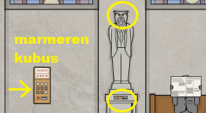 1: Houten kubus, The LakeKijk in het koffertje. Links kun je een plattegrond pakken om snel van het ene naar het andere station te gaan. Open de envelop. Er zit een briefje in van Mr. Owl aan Harvey, waarin hij vraagt hem te bezoeken bij het meer. Rechts bovenaan zie je nu een tekentje waardoor je alle stations kunt bereiken. Klik erop en kies het meer. Ga de trein uit en praat een paar keer met de duiker op het bankje. Hij zegt je de kubussen te verzamelen en dat er op elk station een te vinden is. Pak het muntje (coin) uit zijn hand. Open het doosje. Hierin moet je de kubussen plaatsen. Er zitten er al 2 in. Ga naar rechts en zoom in op de boom in de verte. Je had eerder gezien in Laura's schetsboekje op het Bird Bridge Station, dat er naast de boom (op bladzijde IX) een kuil was gegraven. Klik dus links van de boom op de grond en de kuil is te zien. Bekijk de kuil en pak de houten kubus (wooden cube) eruit. 2: Stenen kubus, Bird Bridge Station De duiker had je een muntje gegeven. Op de perrons kwam je kaartjesautomaten, een telefooncel en een snoepautomaat tegen, waar zo'n muntje te gebruiken zou zijn. Ga naar Sorrow Cross. Ga naar rechts waar de snoepautomaat staat. Doe de munt in de machine. Er is maar &233;&233;n zakje snoep, dat je voor 50 cent kan kopen. Druk op de knop onder het zakje en haal een notenreep (nut bar) uit het bakje. Neem de trein naar School Street. Ga naar rechts en geef de reep aan de blonde jongen met de bril. Hij krijgt een allergische reactie. Praat met hem en hij antwoordt in muzieknoten. Zie de noten die hij zingt: 222123. Neem de trein naar Bird Bridge Station. Ga naar links en zoom in op de trompetspeler. Speel de noten na (222123) en klik 2x op de trompet als de trompettist hapert. Er komt een stenen kubus (stone cube) uit de trompet. Zoom uit en breek de wandtegel uit de muur met het breekijzer. Er zit een briefje van 50 (bill) achter de tegel. 3: Benen kubus, Sorrow Cross Ga bij de trompetspeler 2x naar rechts waar de kiosk is voor drank en etenswaren. Geef de man het biljet van 50 en kies de donut. Ga naar links en geef de donut aan Bob. Praat met hem. Hij zegt dat een mysterieuze vrouw om 12 uur het station met rode tegels bezoekt. Bekijk ook bladzijde V en X in Laura's tekenschrift. Ga naar station Sorrow Cross. Ga 2x naar links en zet de klok op 12 uur. Ga naar links. Je ziet rechts van de snackautomaat een vrouw staan. Pak de benen kubus (bone cube) uit haar hand. Ga naar links. Breek het kastje rechtsachter de zwarte figuur open met het breekijzer. Doe dat in totaal drie keer. Je ziet 9 vakjes. De bovenste drie zijn donker, net als het vakje rechtsonder. Je had zulke vakjes bij de kaartautomaat gezien in het Child Lanestation. 4: Marmeren kubus, Child Lane ![]() Ga naar Child Lane. Ga naar links. Bekijk de kaartjesautomaat. Maak de bovenste knoppen van de kaartautomaat wit, net als de knop rechtsonder. De andere knoppen moeten grijs zijn. Druk op de knop en je vindt de marmeren kubus (marble cube) Verf de ogen van Mr. Owl rood. Onder hem gaat een vakje open. Pak sleutel 9 (locker key) uit het vakje. 5: Koperen kubus, Soul Street Ga naar Soul Street. Ga naar links. Gebruik de sleutel om het kluisje open te maken. NB: Als je de sleutel niet ziet, is de inventaris vol. Klik onderaan op het pijltje om meer voorwerpen te zien. Er komt een koperen kubus uit het kluisje. Ga 2x naar rechts. Vul de emmer met water. 6: IJskubus, School Street Ga naar Crib Station. Ga naar rechts en gooi water in het rooster. Klik erop en je ziet naast elkaar 5 plekken met pijltjes tussen de tralies. Je ziet: 2 pijltjes naar onder - 1 naar links - 1 naar boven en 1 naar onder - 1 naar rechts - 2 pijltjes naar onder. ![]() ![]() Ga naar School Street en bekijk de kaartjesautomaat. Klik op bovengenoemde pijltjes en druk op de knop. Er valt een ijskubus (ice cube) in het bakje. Ga naar Soul Street. Ga naar rechts en vul je emmer met water. 7: Bronzen kubus, Crib Station Ga naar Bird Bridge Station. Ga naar rechts en gooi water in de afvoerput in de grond. Er komt een visnetje (fishing net) boven drijven. Pak het netje. Ga terug naar Soul Street en daar naar rechts. Bekijk de plas water. Er springt steeds een vis naar boven. Vang de vis met het netje. Je moet daarvoor redelijk precies zijn. Maak hem dood met het breekijzer en pak het sleuteltje (key) uit de vis. Ga naar Crib Station. Ga naar links en open het rechter ticketloket met de sleutel. Schuif het luikje open en praat met de kaartverkoper. Hij wil een garnaal hebben voor een ticket. Pak de bronzen kubus (bronze cube). Ga naar The Lake. Stop de zeven kubussen in het koffertje. De duiker geeft je een garnaal (shrimp). Ga terug naar Crib Station. Ga naar links en geef de garnaal aan de kaartverkoper achter loket 2. Je krijgt een gouden kaartje (golden ticket) en hoort dat de trein om 2.25 uur vertrekt. Ga naar links en zet de klok op 2.25. Een gouden trein komt eraan. Open de deur en ga de trein in. Mr Crow is de conducteur. Laat het kaartje knippen, sluit de deur en klik op de deur zodat de trein vertrekt. De trein komt aan bij het Rusty Lakehotel aan de oever van het meer. Open de deur en ga de trein uit. Luid de bel, zoom uit en er komt een roeibootje langs gevaren. Stap erin. Klik 3x op het hotel om ernaartoe te varen. Klop op de deur. Je ziet Mr. Owl. Hij spreekt je aan met de naam Harvey. Praat met hem. Hij zegt dat er werk te doen is en kondigt het volgende spel aan: The Day of the Lake. ![]() ![]()