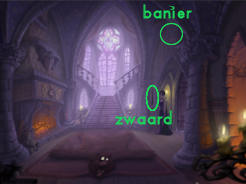 Probeer naar de banier te vliegen. Mona vliegt niet; ze vindt dat de banier niet stevig genoeg bevestigd is, maar ze onthoudt dat hij hier hangt. Nu heb je ook een blauwomrande banier (banner) in je inventaris.