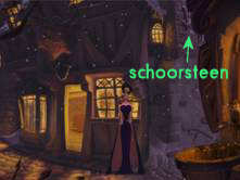 Loop naar rechts, voorbij de stal, naar de kledingzaak. Als je dit nog niet gedaan hebt, neem dan het blauwomrande hoofd van de sneeuwpop mee, die voor de stal staat.